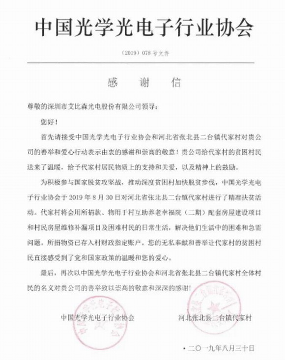 順應(yīng)國家政策,積極響應(yīng)號召,2019年艾比森與中國光學(xué)光電行業(yè)協(xié)會一起,參與到了幫助代家村的扶貧行動中。為積極參與國家脫貧攻堅戰(zhàn),推動深度貧困村加快脫貧步伐貢獻力量。