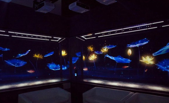 此展項在2019年北京國際攝影周上初次亮相,以“水鄉(xiāng)遇到水城”為主題,用沉浸折幕投影展出優(yōu)秀攝影作品,科技遇上藝術(shù),碰撞出美麗的創(chuàng)意花火。由三臺攝影機(jī)同時拍攝的影像,經(jīng)由多通道邊緣融合,在三折幕上重新融合成一個完整的畫面,真實地還原了拍攝時的人眼視角。未到水鄉(xiāng),已身在水鄉(xiāng)。