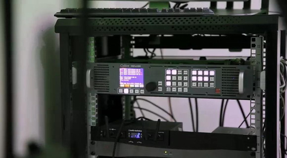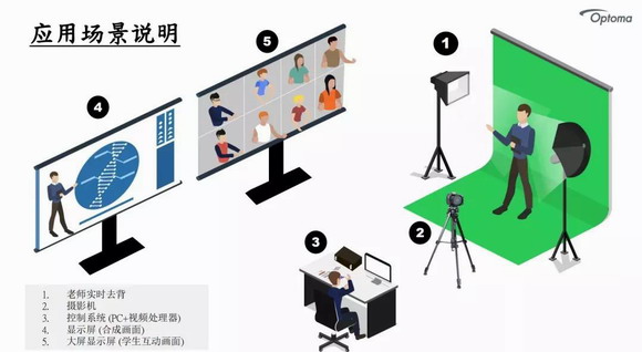 在使用這套系統(tǒng)時,教師一個人就能完成授課過程:教師在綠幕棚進(jìn)行錄像,影像將會被傳輸?shù)綂W圖碼HQ Pro 1000影音處理器中,處理器會將課程需要的的背景畫面、PPT簡報、3D畫面甚至AR影像與教師講課的身影融合,呈現(xiàn)出更加的沉浸的教學(xué)效果,然后實時將畫面?zhèn)鬟f到學(xué)生的屏幕上。