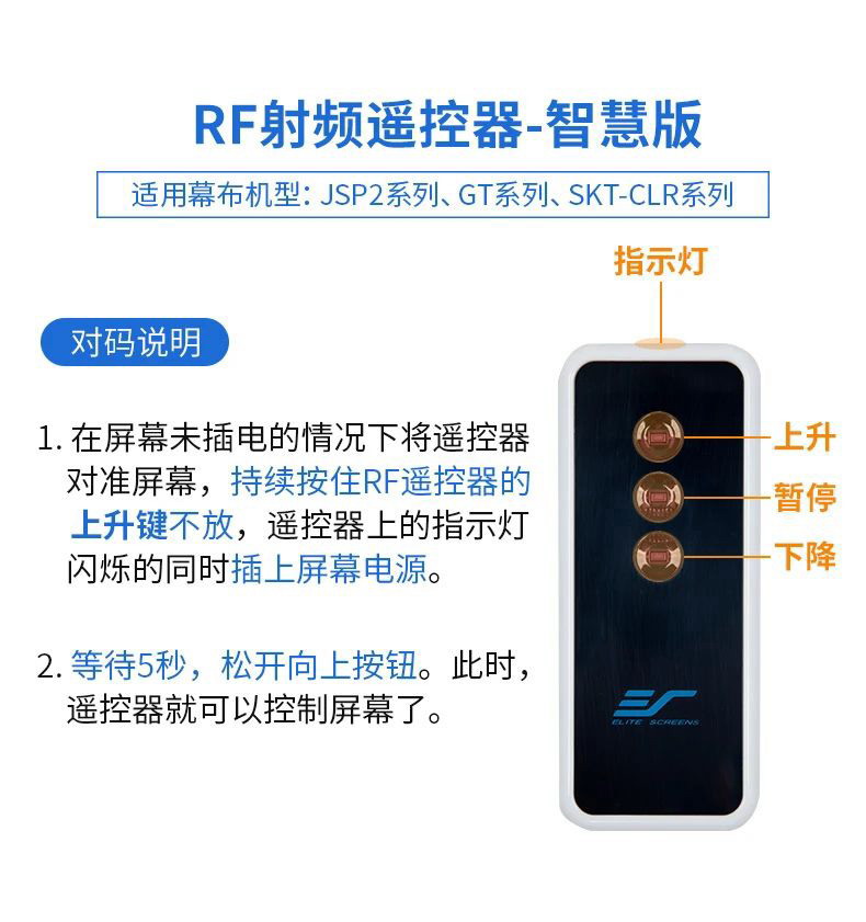 RF射頻遙控器-智慧版適用的幕布機(jī)型有:JSP2系列、GT系列、SKT-CLR系列,不過需要對(duì)碼才能使用,如何對(duì)碼請(qǐng)看圖片介紹。