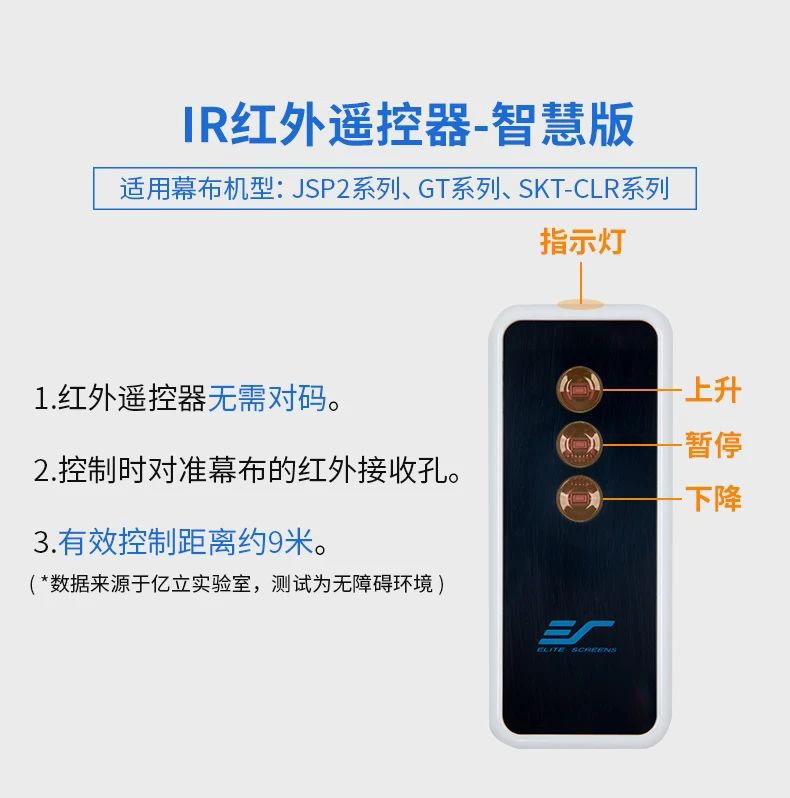 IR紅外遙控器則是利用波長為0.76~1.5μm之間的近紅外線來傳送控制信號(hào)的遙控設(shè)備。IR紅外遙控器-智慧版適用的幕布機(jī)型有:JSP2系列、GT系列、SKT-CLR系列。IR紅外遙控器無需對(duì)碼,使用時(shí)只需對(duì)準(zhǔn)幕布的紅外接收孔,有效控制距離可達(dá)9米。