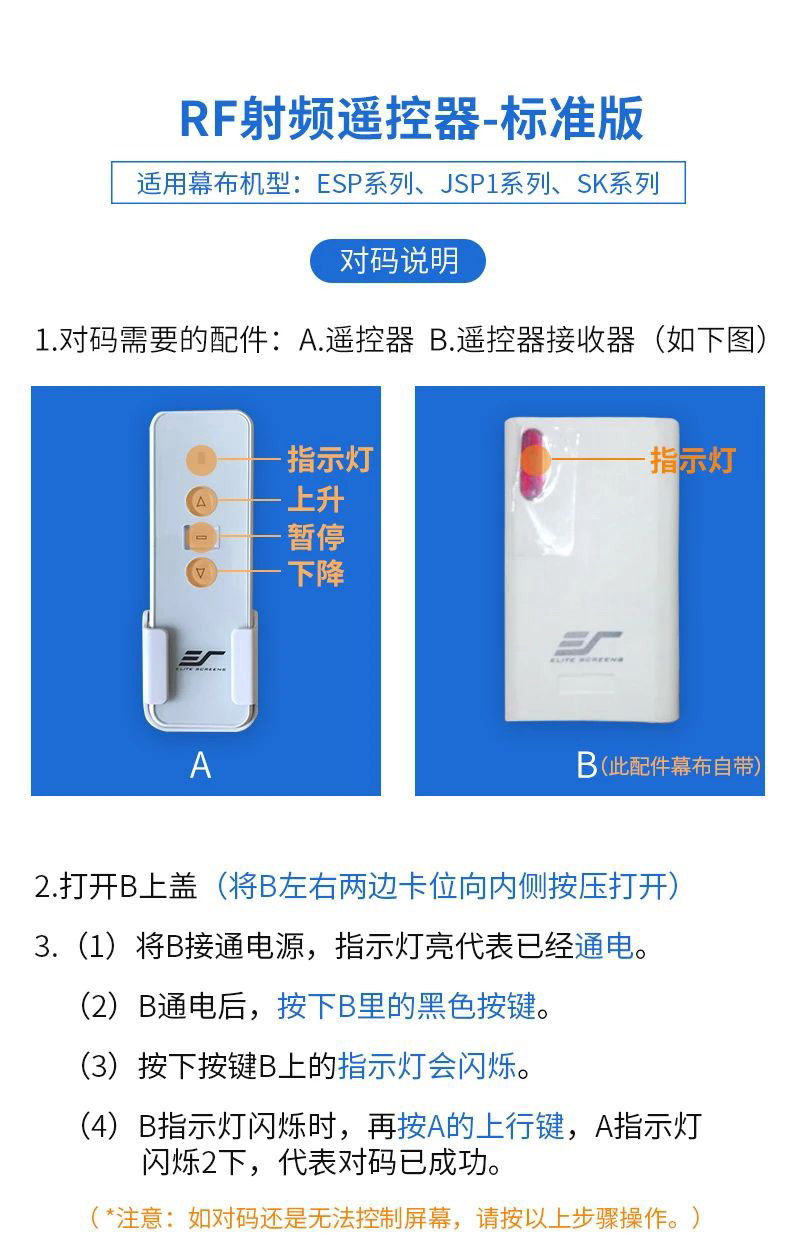 RF射頻遙控器-標(biāo)準(zhǔn)版適用的幕布機(jī)型有:ESP系列、JSP1系列、SK系列,標(biāo)準(zhǔn)版的需要對(duì)碼,同時(shí)還需遙控器接收器配合使用(此配件幕布自帶),具體操作流程請(qǐng)看圖片介紹。