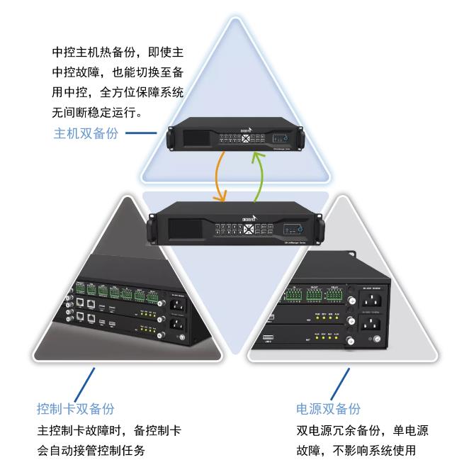 作為各類子系統(tǒng)控制的核心,朱雀中控具備綜合冗余備份機(jī)制,包括雙控制卡熱備、雙機(jī)熱備、雙電源冗余備份等,為設(shè)備安全與穩(wěn)定性提供充足的后備保障。