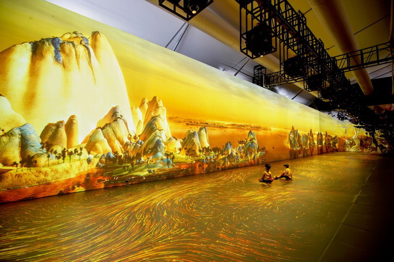 “盛世長卷”是展館最大的獨立單元,采用22臺巴可G60系列投影機。以11x2的組合方式直線排列,墻面和地面相呼應(yīng),地面配合紅外設(shè)備與觀眾實時互動。