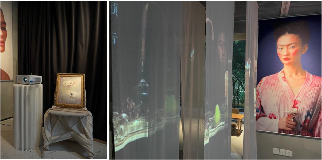 為了讓參觀者有“在場”的視覺體驗,策展人將開幕式的影像記錄下來,通過明基E540投影機在2樓的小劇場中投影出超大畫面,并利用幕布構(gòu)造出一個特殊裝置。在幾片輕紗質(zhì)感的抗光幕布上,兩位演員在餐桌上利用餐具、飾物相互攻擊的動態(tài)影像真實再現(xiàn)。當參觀者穿過幕布的縫隙,影像如水波蕩漾,好似鏡花水月,讓參觀者如臨其境,卻又悵然若失。