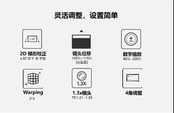 奧圖碼UHZ716高亮智能激光投影機(jī)對(duì)投影尺寸的兼容性極高,2.68米可以投射出100英寸巨幕,5.36米投影距離則可以實(shí)現(xiàn)200英寸巨幕。為了讓用戶更便捷地調(diào)整投影畫面,這款投影機(jī)擁有4角調(diào)整、2D梯形校正、鏡頭位移等一系列優(yōu)化功能,在空間受限的環(huán)境里,依然可以呈現(xiàn)方方正正不畸變不變形的投影效果。