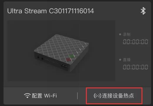 打開Ultra Stream App,在應(yīng)用程序的設(shè)備列表中找到對(duì)應(yīng)序列號(hào)的編碼盒。點(diǎn)擊“連接設(shè)備熱點(diǎn)”,啟動(dòng)編碼盒的AP連接模式。