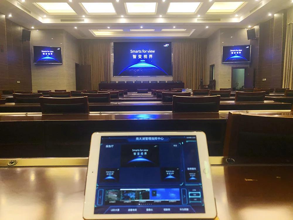 在該項(xiàng)目中,無(wú)論是主樓不同樓層指揮室大廳、會(huì)商室、大會(huì)議室、應(yīng)急指揮室還是副樓的報(bào)告廳,均實(shí)現(xiàn)了會(huì)議室間的音視頻的互聯(lián)互通。會(huì)議室內(nèi)各自設(shè)有對(duì)應(yīng)的pad端,工作人員可在pad端可對(duì)會(huì)議室內(nèi)的外設(shè)(大屏開關(guān)、攝像頭、無(wú)紙化、電子桌牌升降、音頻處理器等)進(jìn)行可視化調(diào)度。項(xiàng)目還配置了總控pad,一端實(shí)現(xiàn)對(duì)5個(gè)會(huì)議室的集中控制管理,進(jìn)一步降低工作人員的日常管理工作量。