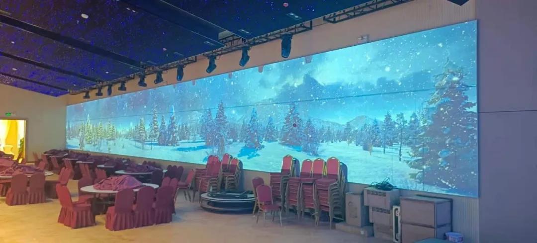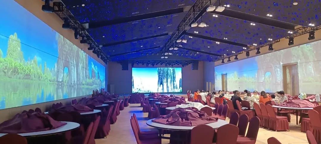 甘南州迭部縣生源禮宴中心作為當?shù)馗叨说亩Y宴中心,為了響應這一號召,全新升級打造了數(shù)字沉浸式宴會廳。其中,共使用16臺理光PJ YX620高亮專業(yè)工程投影機來展現(xiàn)自然風光。動態(tài)畫面的呈現(xiàn)讓整個宴會廳在視覺上打破了空間的約束感,令來賓感到放松愉悅,沉浸于大自然的美景之中。