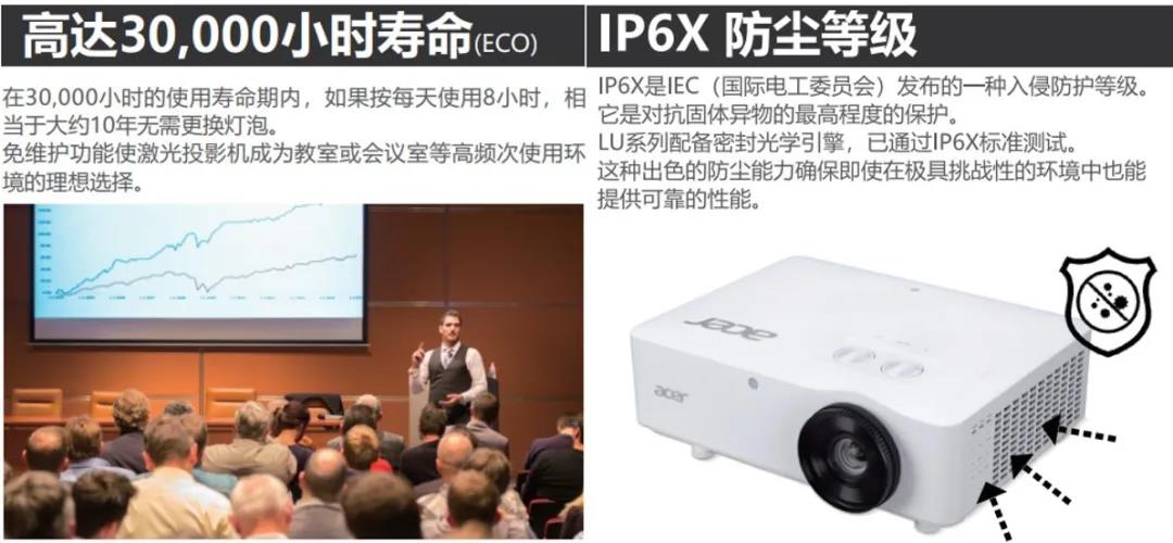 相較傳統(tǒng)投影儀中的燈泡光源,LU-P600UT投影機(jī)的激光光源亮度衰減更低,具備更高的穩(wěn)定性和更長(zhǎng)的壽命(高達(dá)30,000小時(shí)壽命),減少因頻繁更換燈泡造成的資源浪費(fèi)及環(huán)境污染等問題。即使投影教室長(zhǎng)期滿課,LU-P600UT也能為課堂持續(xù)提供技術(shù)保障。此外,LU-P600UT支持梯形校正技術(shù),安裝便捷,防塵等級(jí)為IP6X,能夠有效阻止教室里的粉筆灰塵進(jìn)入,避免積灰導(dǎo)致投影機(jī)無(wú)法使用的情況,降低設(shè)備維護(hù)成本,長(zhǎng)效維護(hù)智慧課堂的投影質(zhì)量。