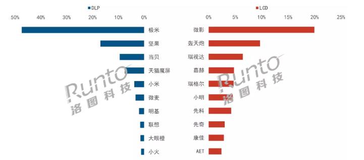 微影在前三季度均位列第一,三季度銷量份額接近20%,較去年同期微增0.3個百分點(diǎn)。轟天炮和瑞視達(dá)位列第二、三位,但市場份額較去年均有所下降。新晉品牌小明瞄準(zhǔn)年輕群體,在供應(yīng)鏈上實(shí)現(xiàn)國產(chǎn)化替代,產(chǎn)品主打高清便攜,定價(jià)千元檔,第三季度排名第六位?导艳D(zhuǎn)向LCD市場,三季度推出3款新品,借助其強(qiáng)大的品牌號召力和完善的渠道布局,進(jìn)入前十。