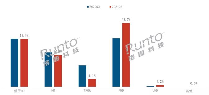 根據(jù)洛圖科技(RUNTO)線上數(shù)據(jù)顯示,得益于FHD新品增多,2021年第三季度,智能投影市場中FHD為主銷分辨率,份額達(dá)到41.7%,較去年同期增長10.0個百分點(diǎn)。在極米、當(dāng)貝、優(yōu)派、愛普生等品牌的帶動下,UHD市場份額達(dá)到1.2%,較去年同期增長0.8個百分點(diǎn)。