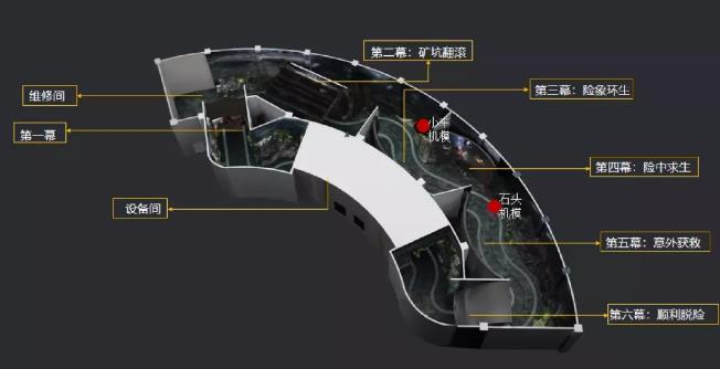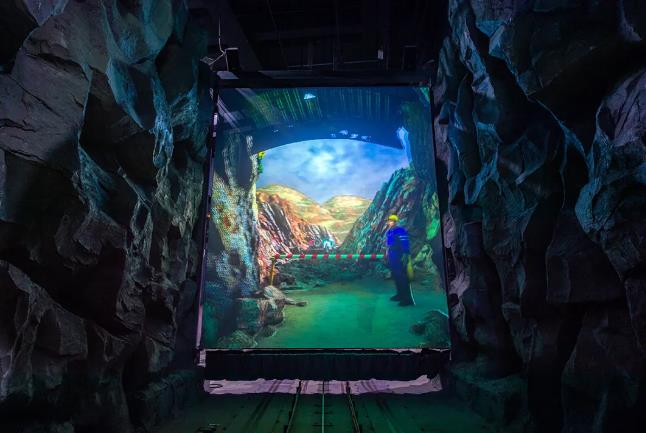 行進(jìn)期間,軌道車會(huì)產(chǎn)生急轉(zhuǎn)彎、擺動(dòng)、顛簸等動(dòng)作,周圍的仿真布景和投影畫面會(huì)模擬出落石、山洪、山體滑坡的景象,讓參觀者在虛實(shí)結(jié)合的環(huán)境中穿行,切身感受礦山的惡劣環(huán)境和生態(tài)危機(jī)。
