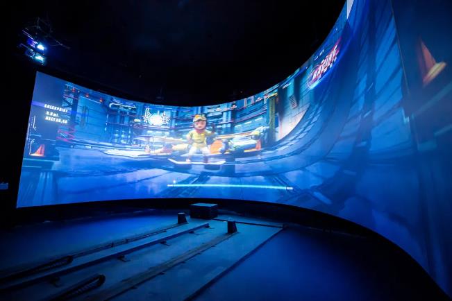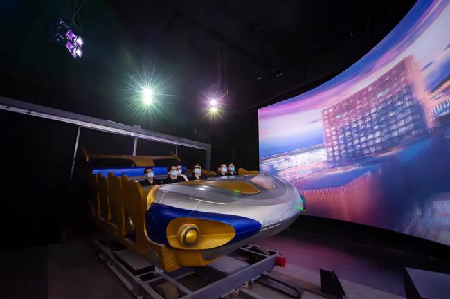 “威海之翼”是利用工程投影打造的虛擬過山車展項(xiàng),講述了一個(gè)環(huán)游威海的冒險(xiǎn)故事。該展項(xiàng)分為投影系統(tǒng)和動(dòng)感基座兩部分組成,影片播放時(shí)電動(dòng)飛行器配合六向自由度座椅做出俯沖、擺動(dòng)等動(dòng)作,全方位模擬飛行體驗(yàn)。