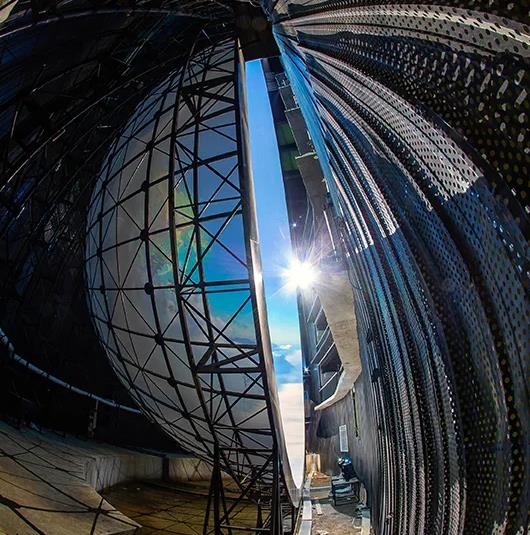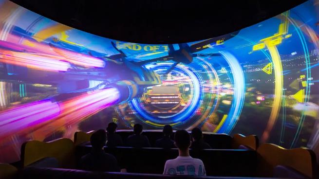 《飛越華夏》球幕影院采用了當(dāng)今最流行的俯仰式巨幅球幕影院系統(tǒng),25米直徑的半球形銀幕,維度162°,整體傾斜90°,配合96套活動(dòng)座椅,與影片鏡頭進(jìn)行實(shí)時(shí)聯(lián)動(dòng),讓觀眾跟隨影片體驗(yàn)高空飛翔、極速墜落等激動(dòng)人心的場(chǎng)景。
