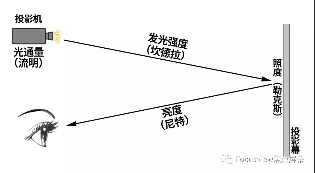 投影機(jī)的光經(jīng)過(guò)幕布的反射,進(jìn)入觀看者的眼睛,這時(shí)候人眼感受到的光的強(qiáng)度,就是亮度啦,單位是坎德拉每平方米(cd/m2),也就是我們常說(shuō)的尼特。