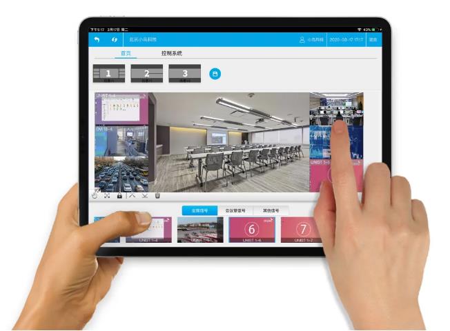 小鳥青鸞分布式可視化軟件平臺橫向打通各子系統(tǒng)的協(xié)作通道,對大屏顯示控制系統(tǒng)、視頻處理系統(tǒng)、音頻處理系統(tǒng)、中央控制系統(tǒng)、媒體錄播系統(tǒng)等進行統(tǒng)一管理,實現(xiàn)互聯(lián)互控。使用者無須對應接口編號查找視頻源,通過PAD上顯示的預覽畫面即可鎖定相應輸入源,實現(xiàn)快速切換,防止誤操作。支持在同一平臺下,多個人員分別操作不同應用,完成整體協(xié)作,所有操作完全同步顯示。