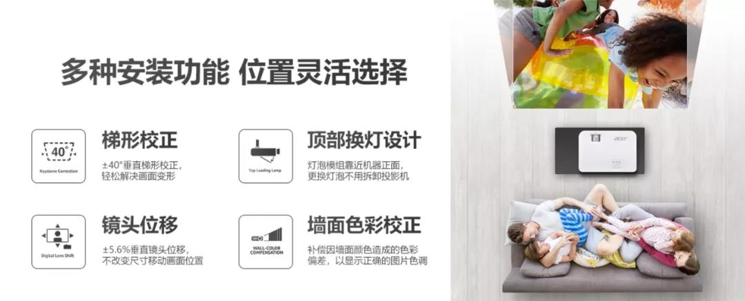 家居使用時,因投影機擺放位置而導(dǎo)致投射位置無法正對,這時可使用菜單中梯形校正功能,通過對畫面的40°垂直水平梯形校正,或是鏡頭位移功能,±5.6%垂直鏡頭位移,在不改變尺寸移動畫面位置,輕松使得畫面回歸C位,讓HF130投影機在家的各個地方都可方便靈活的使用。