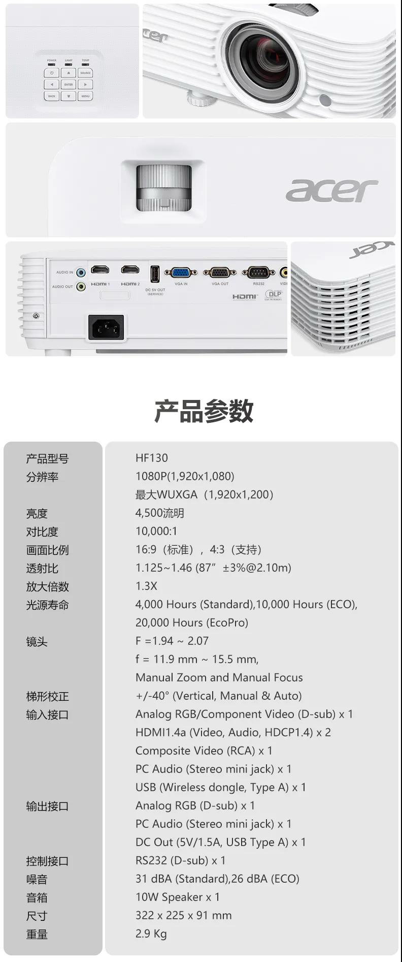 宏碁(Acer)家用投影機HF130,為小空間用戶提供的家用大屏投影機,短距黃金投射比100英寸僅需2.4米,擁有4500ANSI高流明智能光感白天直投,1080P分辨率畫質(zhì)清晰,更有LUMISENSE內(nèi)容感知技術(shù)動態(tài)調(diào)整圖像優(yōu)質(zhì)表現(xiàn),同時120Hz刷新率與8.3ms的低延遲,支持3D觀影,為影音用戶和游戲玩家提供流暢的大屏體驗。