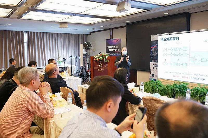 天創(chuàng)產(chǎn)品經(jīng)理、高新負(fù)責(zé)人周郁璇詳細(xì)介紹了“智鐵”會(huì)議管理系統(tǒng)與“智備”系統(tǒng)備份解決方案。這套高品質(zhì)的系統(tǒng)采用鐵三角會(huì)議話筒與功能強(qiáng)大的Biamp TesiraFORTÉ系列數(shù)字音頻處理器相結(jié)合,可真實(shí)還原人聲、遠(yuǎn)距離拾音,并實(shí)現(xiàn)擴(kuò)聲系統(tǒng)備份。