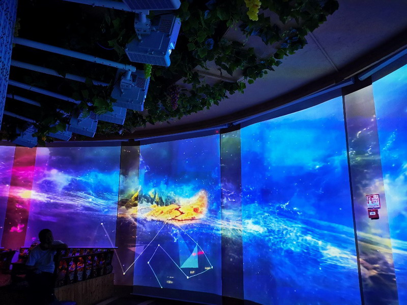 觀光塔內(nèi)部,11臺NEC騎士系列CS3300WL(4000流明、DLP激光、0.52投射比)通過豎投融合,實(shí)現(xiàn)弧長約14米,高約2.6米的弧形投影,超大弧形畫面震撼人心。每當(dāng)夜幕降臨,光影點(diǎn)亮,原生純粹的大漠風(fēng)光、負(fù)重前行的沙漠之舟,仿佛令我們穿越時(shí)光,回到了絲綢之路最繁華的年代。