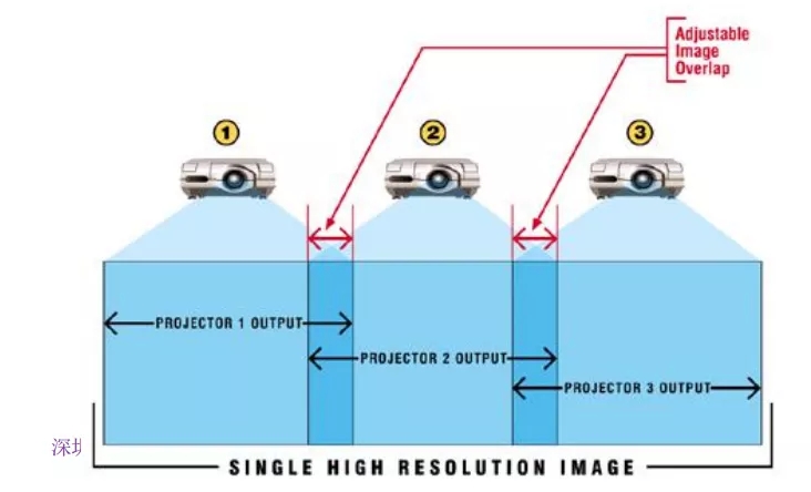 當(dāng)兩臺或多臺投影機(jī)組合投射一幅兩面時,會有一部分影像燈光重疊,邊緣融合的最主要功能就是把兩臺投影機(jī)重疊部分的燈光進(jìn)行漸變調(diào)整,使重疊區(qū)的亮度對比度與周邊圖像一致,從而使整副畫面完整統(tǒng) 一,絲毫看不出是多臺投影機(jī)拼接的結(jié)果。隨著投影顯示技術(shù)的不斷發(fā)展與創(chuàng)新,邊緣融合技術(shù)在支持超寬屏幕投影顯示方面正在迅速流行。下圖是一個典型的三通道無縫投影系統(tǒng),3臺投影機(jī)被用來將顯示內(nèi)容投影在同一個很寬的屏幕上,產(chǎn)生一個高分辨率、視場連續(xù)、無縫、亮度與顏色一致的圖像。