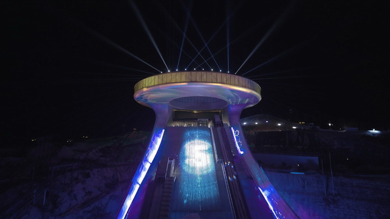 據(jù)了解,此次國(guó)家跳臺(tái)滑雪中心頂峰俱樂(lè)部的燈光秀由國(guó)內(nèi)專(zhuān)業(yè)燈光設(shè)計(jì)團(tuán)隊(duì)——豪爾賽科技集團(tuán)股份有限公司設(shè)計(jì)并提供,由安恒集團(tuán)提供投影系統(tǒng)解決方案的設(shè)計(jì)和調(diào)試。系統(tǒng)共采用了32臺(tái)31,000流明的松下激光光源工程投影機(jī)PT-SRZ31KC以及24臺(tái)16,000流明的松下液晶激光工程投影機(jī)PT-SMZ16KCL,對(duì)頂峰俱樂(lè)部的圓環(huán)外側(cè)以及底部進(jìn)行投射。