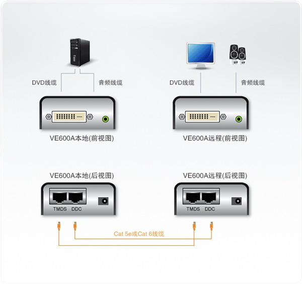 VE600A為一款具備音頻功能的DVI信號(hào)延長器,其可通過Cat 5e連接線延伸DVI顯示器與DVI信號(hào)來源設(shè)備達(dá)60m遠(yuǎn)。使用Cat 5e線纜可提供簡單且可靠的連接,相當(dāng)適合用于現(xiàn)在的大樓布局環(huán)境。VE600A更采用ATEN技術(shù),僅需一條Cat 5e線纜即可傳輸影像與音頻信號(hào);若需傳送顯示器EDID信號(hào),則需使用第二條Cat 5e線纜。通過立體聲音頻傳輸以及寬屏幕格式的支持,VE600A提供了遠(yuǎn)程設(shè)備清晰的影像與聲音質(zhì)量。