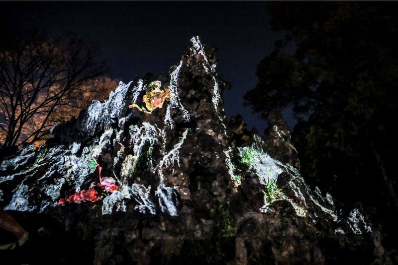 首先最給人帶來震撼的,是由15,000流明*1*2的愛普生激光工程投影機CB-L1755U NL搭載ELPLM15鏡頭實現的3D mapping方案。CB-L1755U NL將流水和動植物的影像投映在山石上,其機身自帶自動色差校準系統,當屏幕顏色不均衡時,機身內置攝像頭能夠自動檢測并調整顏色,還可以設置手動或自動檢查常規(guī)間距間的顏色,保證色彩亮度的同時,提供穩(wěn)定的畫面質量。因此,即使是在崎嶇不平的山體上進行投影,影像依舊清晰且穩(wěn)定。