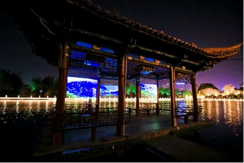 湖中央的亭子中,2臺6,000流明愛普生激光工程投影機CB-L615U在紗幕上投下色彩亮麗的影像,為夜游的游客們展示大觀公園白日里的風光,遠遠看去仿佛懸浮在空中的畫面,隨風而動,如在夢里。