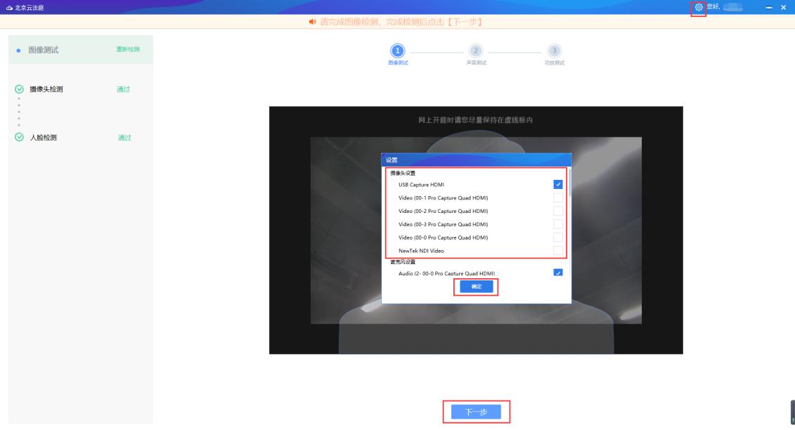 4、登錄“北京云法庭”軟件,點(diǎn)擊右上角“設(shè)置”,在彈出設(shè)置-攝像頭設(shè)置列表中可以看到美樂(lè)威USB Capture HDMI視頻采集棒和Pro Capture Quad HDMI四路視頻采集卡。“北京云法庭”軟件可以自動(dòng)識(shí)別美樂(lè)威視頻采集設(shè)備并實(shí)現(xiàn)視頻采集。在此環(huán)節(jié)中,用戶可以完成圖像檢測(cè)、攝像頭檢測(cè)和人臉檢測(cè)。