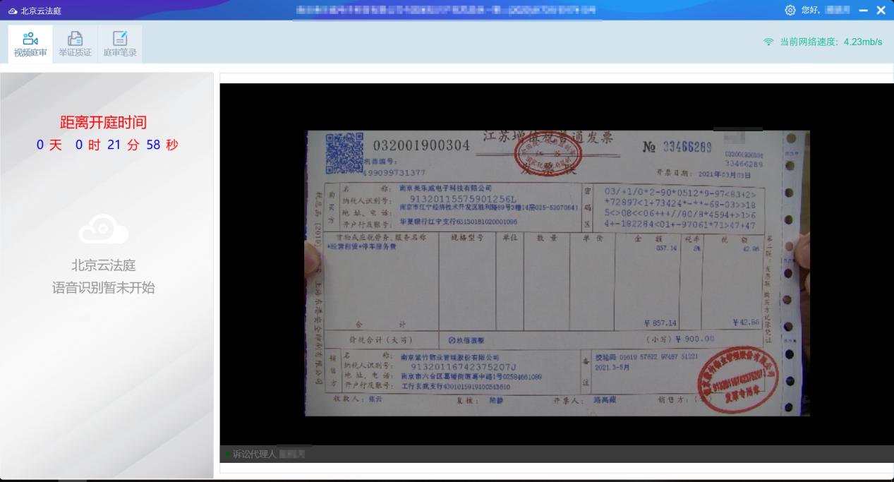 7、線上開庭效果對(duì)比展示。如下是“北京云法庭”舉證效果展示,以發(fā)票單據(jù)舉證為例: