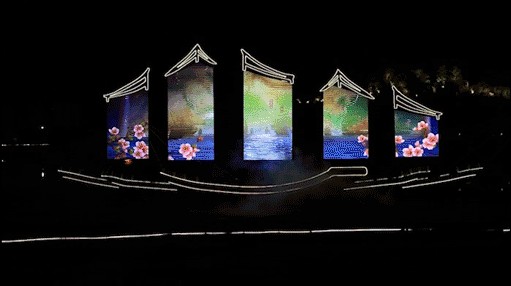 利亞德·勵(lì)豐文化利用湖心島、湖面、綠化等空間維度,結(jié)合LED藝術(shù)裝置船,演繹“春湖盛會(huì)”水舞聲光秀,圍繞“知識(shí)執(zhí)光•百花筑夢(mèng)”、“金鼠閏年•花舞迎春”兩個(gè)主題、六個(gè)篇章,展示中心知識(shí)城的發(fā)展歷程,結(jié)合春節(jié)、迎春花卉等元素,全方位打造一場(chǎng)文化視覺(jué)盛宴。
