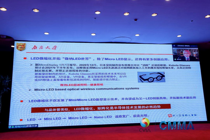 CMMA分會首席科學(xué)家/中國科學(xué)院院士/南京大學(xué)電子科學(xué)與工程學(xué)院教授鄭有炓通過現(xiàn)場連線發(fā)表了主題演講。他在開場先祝賀中國電子視像行業(yè)協(xié)會成立Mini/Micro LED顯示產(chǎn)業(yè)分會,并表示深信,這個分會的成立必將推動我國Mini/Micro LED技術(shù)和產(chǎn)業(yè)的發(fā)展,為我國信息技術(shù)產(chǎn)業(yè)高質(zhì)量發(fā)展做出貢獻(xiàn)。