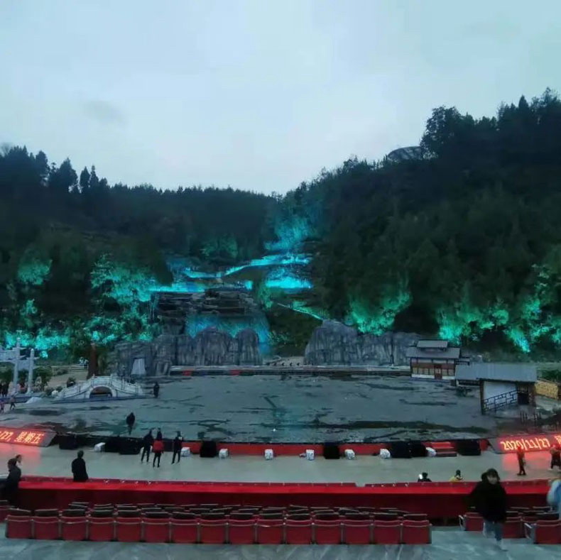 演出的地點(diǎn)依山傍水,可謂是天然好風(fēng)光,同時也面臨著戶外環(huán)境惡劣,低溫、蚊蟲、雨水多,且安裝位置有限,投影機(jī)負(fù)荷過重等問題。