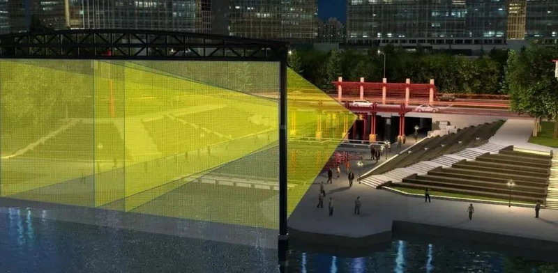該項目充分利用了周邊的環(huán)湖建筑、涼亭、水景等空間載體,通過13棟建筑樓宇,湖面上一塊升降式3D全息屏,近300米跨度的自動起降裝置搭建的透明格柵屏和透明網(wǎng)投影系統(tǒng)裝置,建構(gòu)近、中、遠,高、中、低圍合式舞臺立體空間關(guān)系。