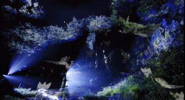 設(shè)計團隊以叢林樹木、瀑布崖壁為天然銀幕,將一段奇景森林投影在上面,一幕幕CG動畫般動物王國故事在觀眾眼前上演。