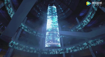 商城兩個圓環(huán)形的LED屏幕結(jié)合中心的360°圓柱形屏幕,把沉浸式的視覺效果演繹到極致。