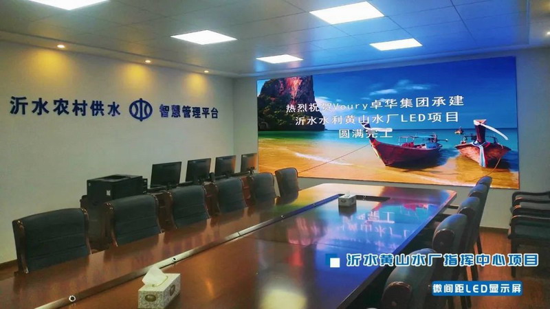 從統(tǒng)籌全局的角度考慮,為擴大信息覆蓋范圍,便于了解各部門動態(tài),及時收到反饋信息,提高日常工作效率,更好地服務于民生,沂水黃山水廠采用Voury卓華微間距P1.5LED顯示屏, 整屏完美無縫拼接,畫面細膩流暢;以其超高對比度、超高刷新率、豐富顯示色彩等調(diào)試效果,助力水利工作者進行音視頻工作溝通,其顯示效果、可靠性與穩(wěn)定性獲得各位領導的一致好評。