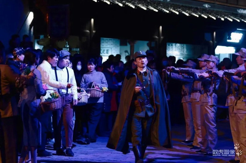 觀眾跟著賣花女、賣糖葫蘆的小販、黃包車夫等游走在老街。戰(zhàn)火紛飛的年代,那些英勇可愛(ài)的人兒曾生活在這片熱土,他們不會(huì)隨著時(shí)代的變遷而湮沒(méi),他們留在了沙家浜,留在了橫涇老街。