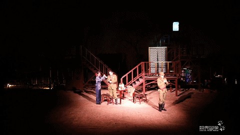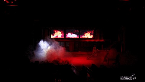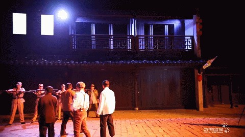 一場(chǎng)激戰(zhàn)在橫涇劇場(chǎng)上演,煙霧在舞臺(tái)上升騰,戰(zhàn)火在二樓屏幕上閃現(xiàn)。機(jī)械轉(zhuǎn)臺(tái),抗戰(zhàn)道具、蹦床,再加上如電影般的特效,為現(xiàn)場(chǎng)觀眾奉獻(xiàn)了一場(chǎng)激烈的戰(zhàn)役。