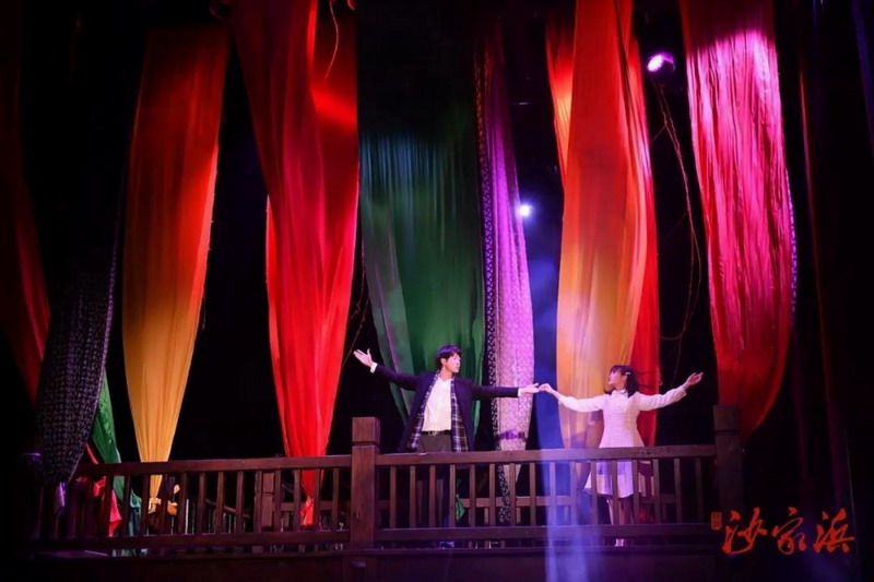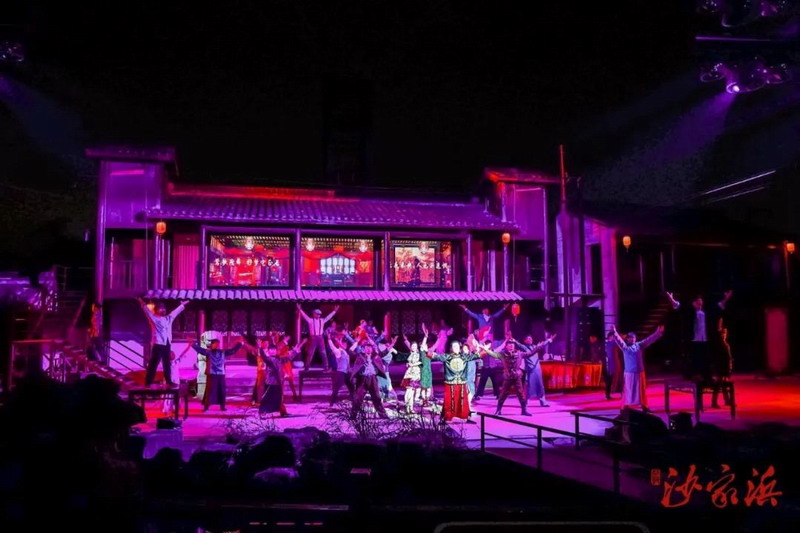 這片如水靜謐,如蘆葦柔韌的土地,不乏紅色精神、革命故事。主創(chuàng)團(tuán)隊(duì)將龐大的敘事串聯(lián),揉碎于細(xì)節(jié),人物和情節(jié)環(huán)環(huán)相扣,劇場(chǎng)與老街絲絲入扣,“歌舞。珣騽 毙纬沙两綉騽”硌,讓觀眾在行進(jìn)中穿越到那個(gè)時(shí)代。用一席婚宴,一段情感,一場(chǎng)陰謀,還原了抗日戰(zhàn)爭(zhēng)時(shí)期的沙家浜,謳歌了軍民魚水情深、共抵日寇惡霸,團(tuán)結(jié)抗日的“沙家浜精神”。
