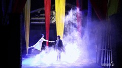 鮮艷的可透的大綢布從高空懸掛落下,演員穿梭于布匹,表演雙人舞雜技,通過(guò)舞姿表達(dá)戰(zhàn)爭(zhēng)年代的愛(ài)情純粹、真摯、熱烈。燈光巧妙的打在布匹上,雪花與霧森暈染出一片清新、自然的意境,一段浪漫、唯美的愛(ài)情,掩映在煙與光重疊的畫面中。