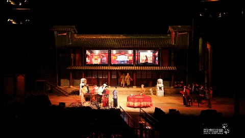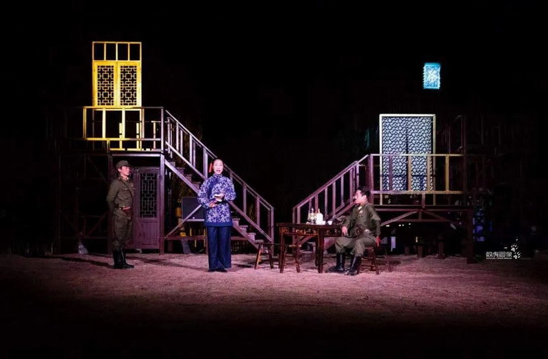 看罷雙人舞表演,游客來(lái)到了春來(lái)茶館。茶幡、四方桌、茶具、隨風(fēng)揚(yáng)起的藍(lán)花布、似屏風(fēng)的木質(zhì)門窗,鋼木結(jié)構(gòu)搭建的春來(lái)茶館更具有戲劇化、舞臺(tái)感,且便于通過(guò)燈光對(duì)演員進(jìn)行調(diào)度,讓觀眾更好的捕捉演員動(dòng)態(tài)、情緒。