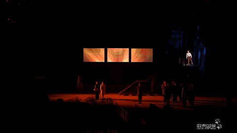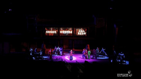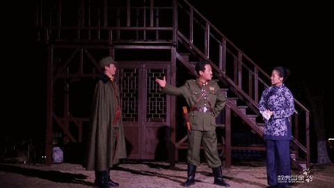 舞臺(tái)呈現(xiàn)三個(gè)表演空間,阿慶嫂和眾人定計(jì)如何智斗胡司令,前區(qū)一片熱鬧的婚禮場(chǎng)景,后區(qū)(二樓投影)舞蹈演員用肢體演繹定計(jì)的內(nèi)容?梢苿(dòng)雙面鼓、屏風(fēng),樓梯等道具,不僅迅速有效的調(diào)度演員,還增強(qiáng)了舞臺(tái)張力。