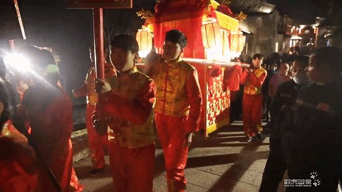 老街上鑼鼓聲聲,鞭炮四起,蘆葦蕩邊嗩吶響,好一派熱鬧場(chǎng)景。喜糖、喜帖、紅燈籠、紅綢等道具應(yīng)有盡有,民國(guó)時(shí)期的婚嫁習(xí)俗真講究。