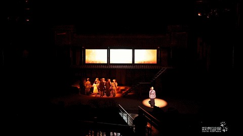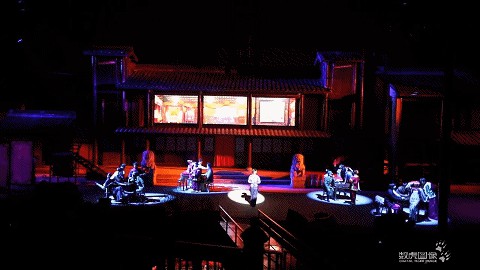 京劇《沙家浜》“智斗”橋段,在春來(lái)茶館再度被傳唱,音樂(lè)低沉舒緩,不同的音樂(lè)曲風(fēng)對(duì)應(yīng)不同人物的性格。藍(lán)白相間的布料,灰白的墻、木質(zhì)的閣樓,斑駁的光影,虛實(shí)結(jié)合的場(chǎng)景、多樣的燈光,觀眾在戲曲中重溫經(jīng)典,享江南風(fēng)韻。