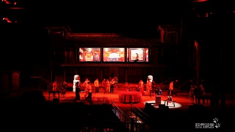 《智斗胡司令》共6幕,分別為“序”、“定計(jì)”、“開(kāi)席”、“日軍來(lái)訪”、“大戰(zhàn)”、“滅胡”。其中,樓下的大舞臺(tái)表演為明線,讓觀眾直白的看到婚慶的喜慶場(chǎng)面,二樓LED投影為暗線,通過(guò)演員的肢體動(dòng)作詮釋新四軍在密謀備戰(zhàn)。在婚禮的暗涌下,一場(chǎng)有計(jì)劃的戰(zhàn)役正在醞釀。