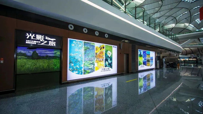 大興機場的“光影之旅”數(shù)字體驗館位于航站樓二層,展廳運用多媒體數(shù)字技術(shù)通過投影、互動、視頻藝術(shù)、音樂等方式,為游客提供了一個欣賞和體驗藝術(shù)的沉浸式互動空間。
