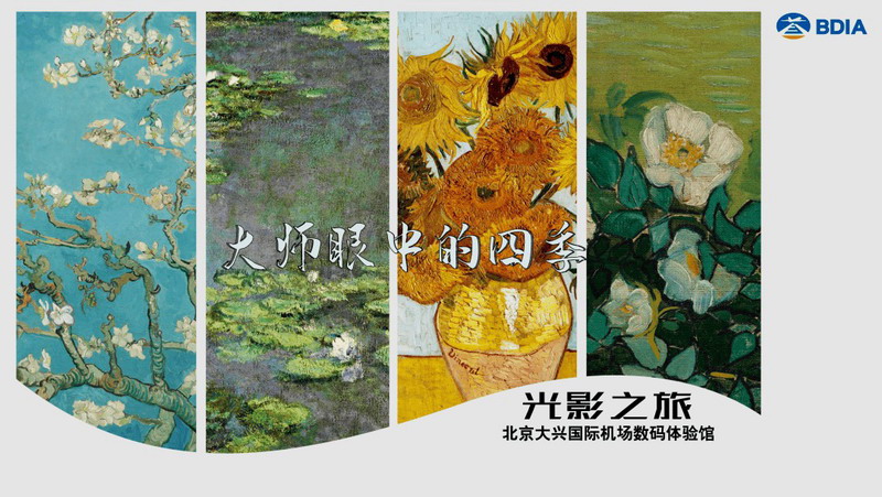 “光影之旅”展廳以“大師眼中的四季”為主題,選用梵高的《杏花》、《綠柏麥田》、《星月夜》、《向日葵》、《豐收》、《野玫瑰》,莫奈的《睡蓮》、《融化的浮冰》,共八幅畫作,展現(xiàn)生長、盛開、成熟、凋零。游客可以置身畫作之中,切身感受四季更替,萬物更新帶來的感動,體會藝術(shù)巨擘畫筆下的大自然。